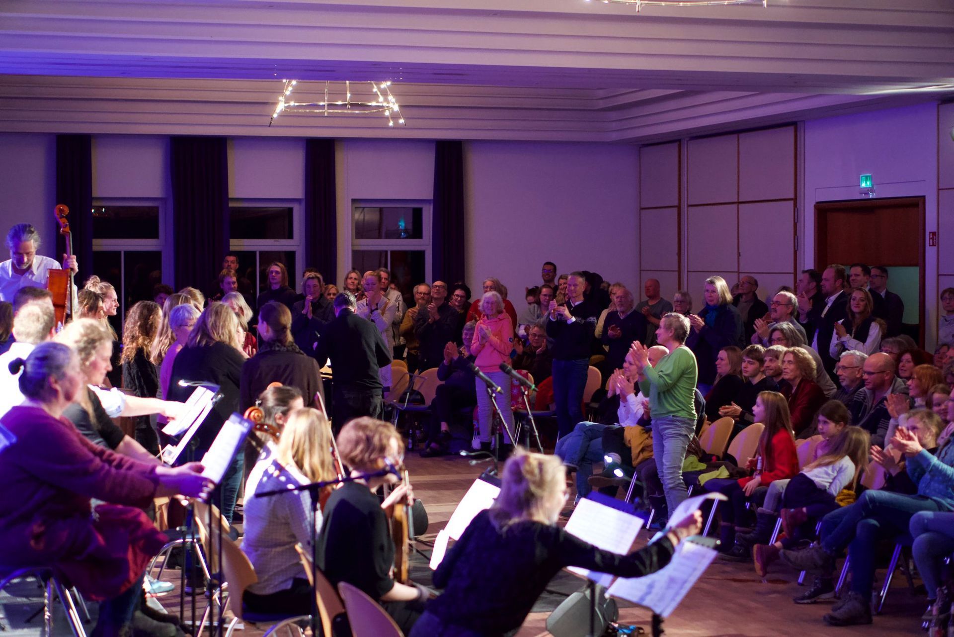 „Bei den ersten Workshopkonzerten waren fünf oder sechs Musiker:innen auf der Bühne und 30 oder 40 im Publikum“, erinnerte sich Peter Dahm, bevor er am Konzertabend vor ausverkauftem Haus Orchester und Sänger:innen auf die Bühne bat. „Dass sich das Ganze so entwickelt hat, ist fantastisch!“