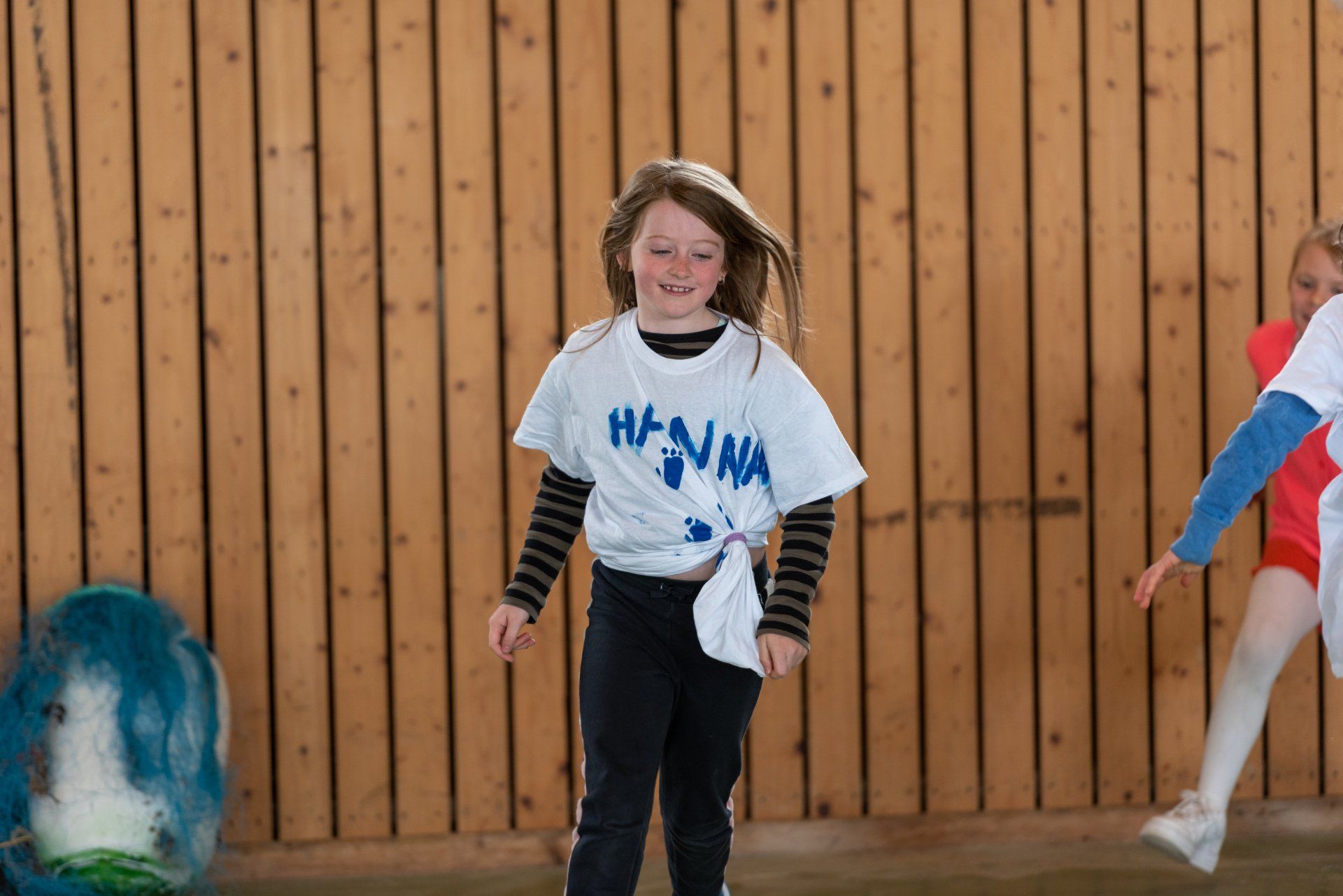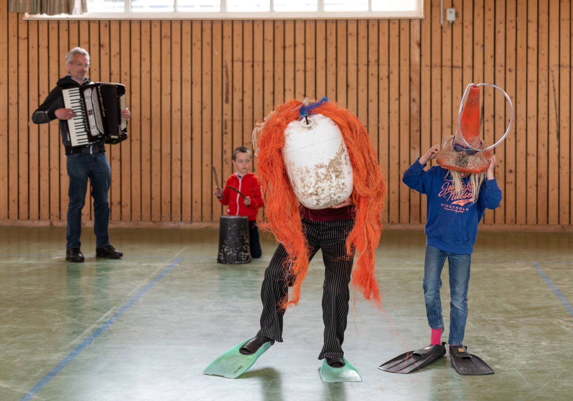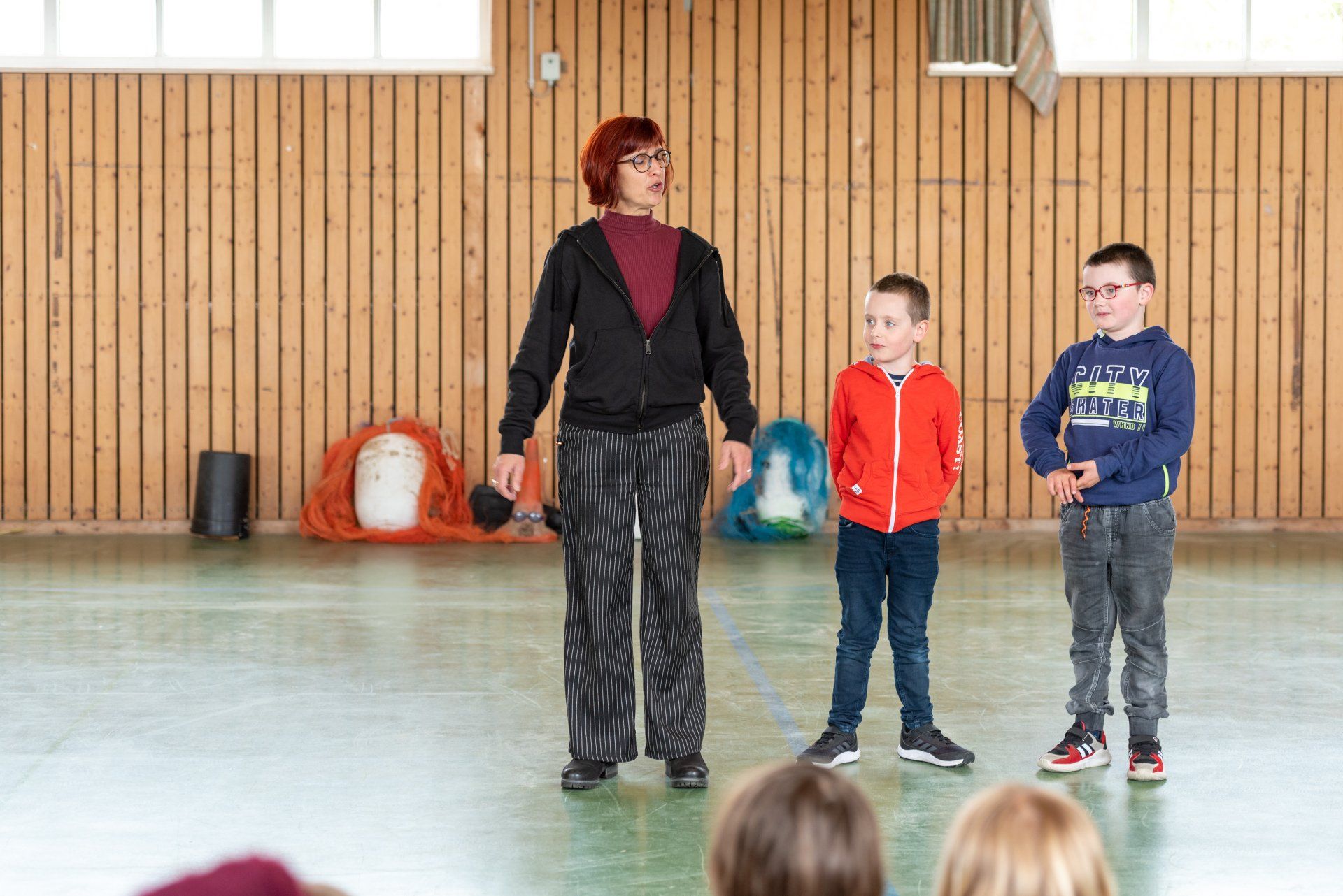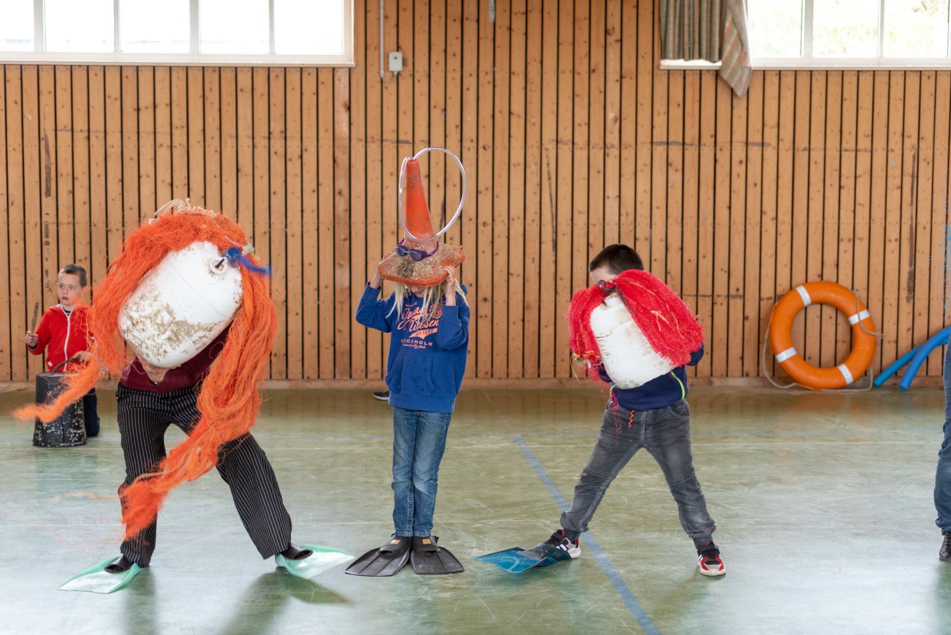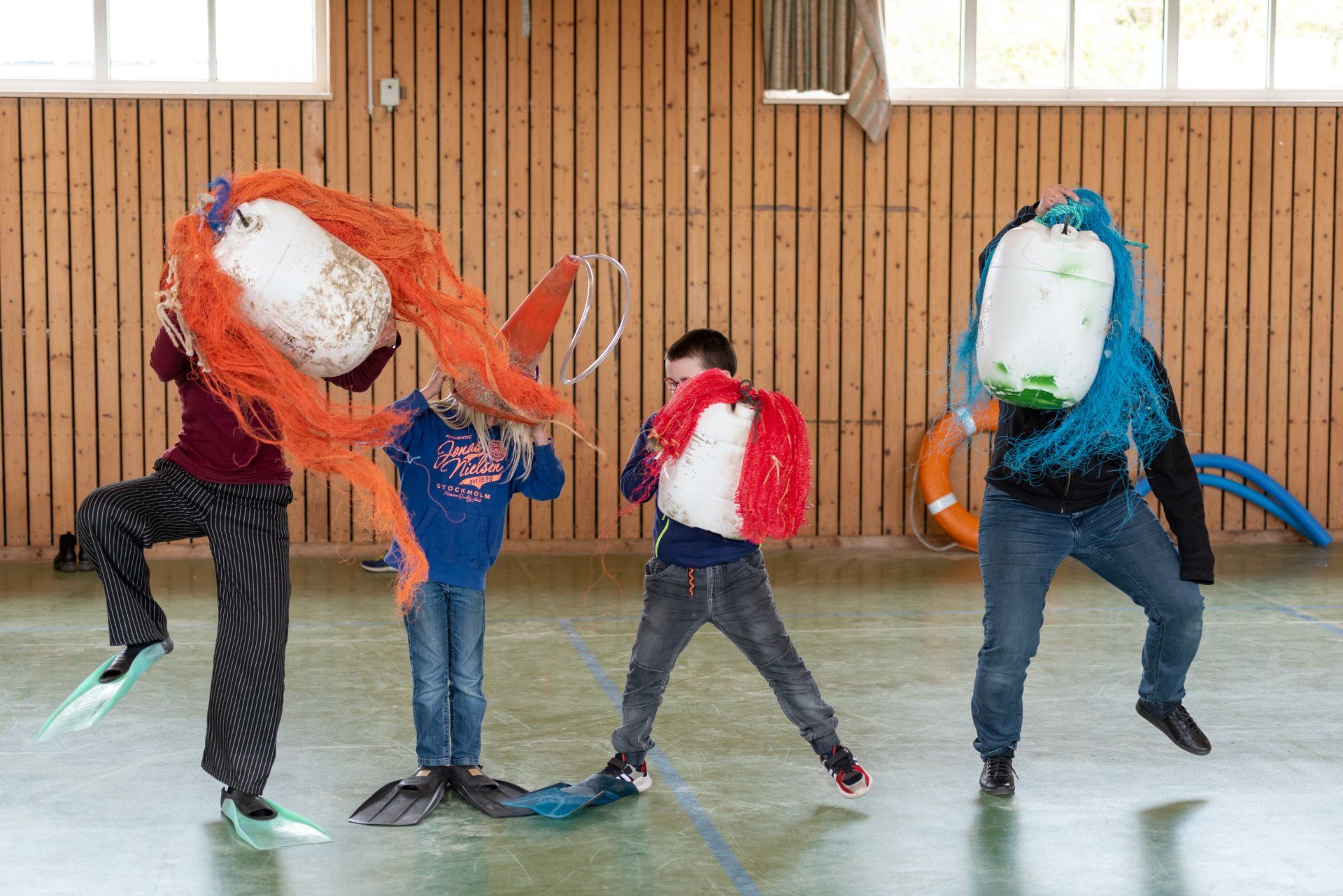 Das Warm-up wurde in der gesamten Gruppe als gemeinsame Einführung durchgeführt und mit dem Fokus auf Bewegung, Stimme und Konzentration gestaltet. Anschließend wurden in den Gruppen verschiedene Themen des Stückes in eigene Szenen mit den Kindern umgesetzt. Mit der Kostümbildnerin wurden T-Shirts bedruckt, in einer Gruppe wurden Figuren gebaut aus angespültem Meeresmüll, es wurde für ein Lied gedichtet und eigene Dialoge entwickelt.