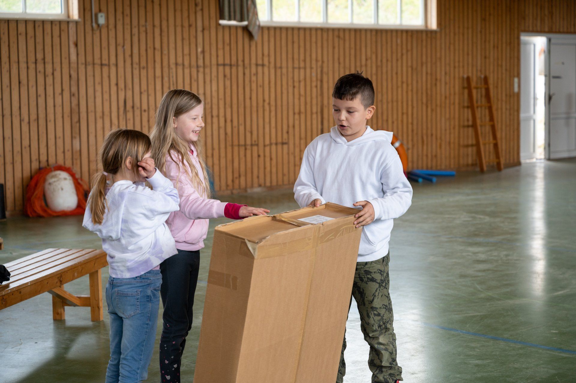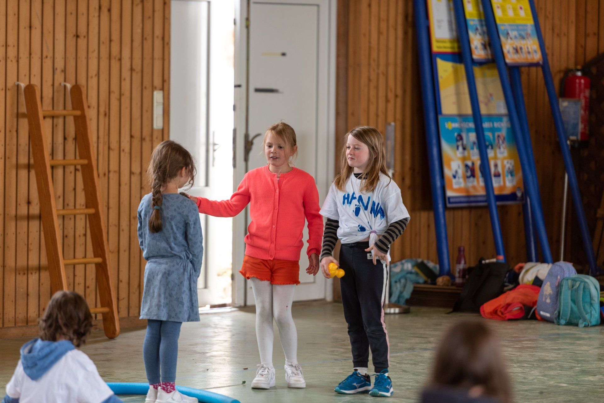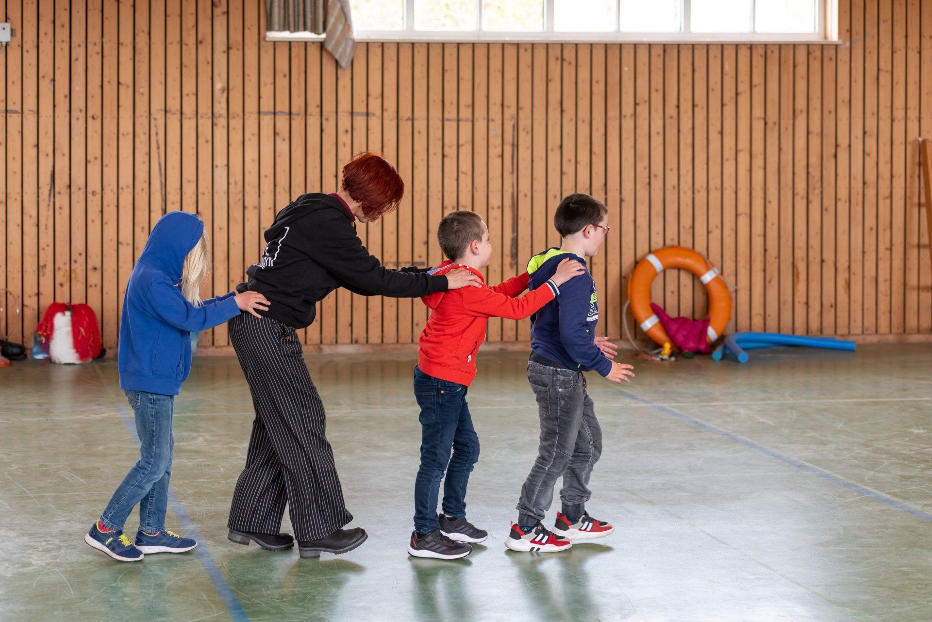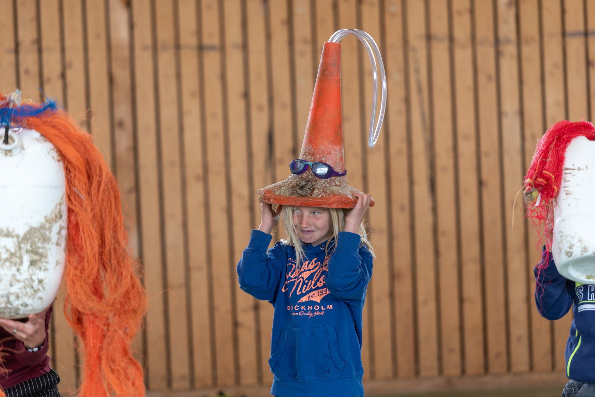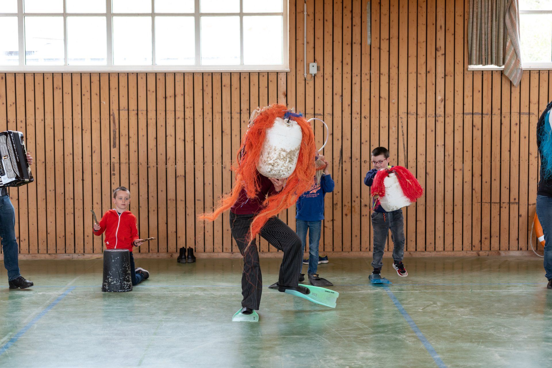 Das Warm-up wurde in der gesamten Gruppe als gemeinsame Einführung durchgeführt und mit dem Fokus auf Bewegung, Stimme und Konzentration gestaltet. Anschließend wurden in den Gruppen verschiedene Themen des Stückes in eigene Szenen mit den Kindern umgesetzt. Mit der Kostümbildnerin wurden T-Shirts bedruckt, in einer Gruppe wurden Figuren gebaut aus angespültem Meeresmüll, es wurde für ein Lied gedichtet und eigene Dialoge entwickelt.