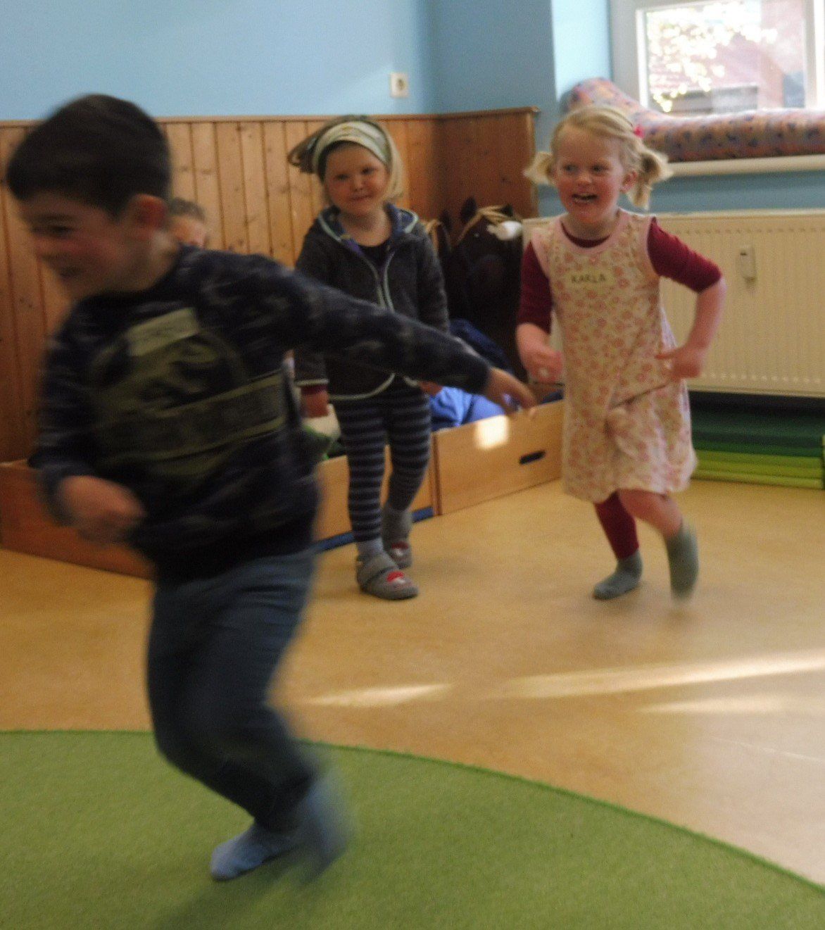 Die Kinder des Kindergartens „Lütt Insulaners“ im Alter von 4 – 6 Jahren wurden in einem dreitägigen Workshop je 2 Stunden am Vormittag von einer Theaterpädagogin und Kostümbildnerin mit Themen der Vorstellung SANDBANK beschäftigt. Es ging um das Reisen und um die Tiere der Insel. Zusammen mit der Kostümbildnerin konnte jedes Kind ein T-Shirt gestalten und mit Textilfarbe bedrucken, sodass dies das Kostüm für die Aufführung wurde. Mit der Theaterpädagogin machten die Kinder spielerisch ein Warm-up für Körper und Stimme und spielten verschieden Tiere und entwickelten kleine Szenen zum Thema „Reisen“. Sie überlegten, was sie selbst auf eine Reise mitnehmen würden und studierten schließlich gemeinsam ein Lied mit Bewegung ein. Sie malten Plakate für ihre Vorstellung, sie lernten, alleine einen kurzen Text aus der Entfernung zu sprechen und zeigten alle Ergebnisse bei der Abschluss-Präsentation im Außenbereich des Kindergartens, die am 13. Mai 2022 vor ca. 40 Zuschauenden (Familie, Freunde und Interessierte) gespielt wurde. Sie hatten das „Verbeugen“ gut einstudiert und freuten sich über den großen und verdienten Applaus, den sie anschließend bekamen.